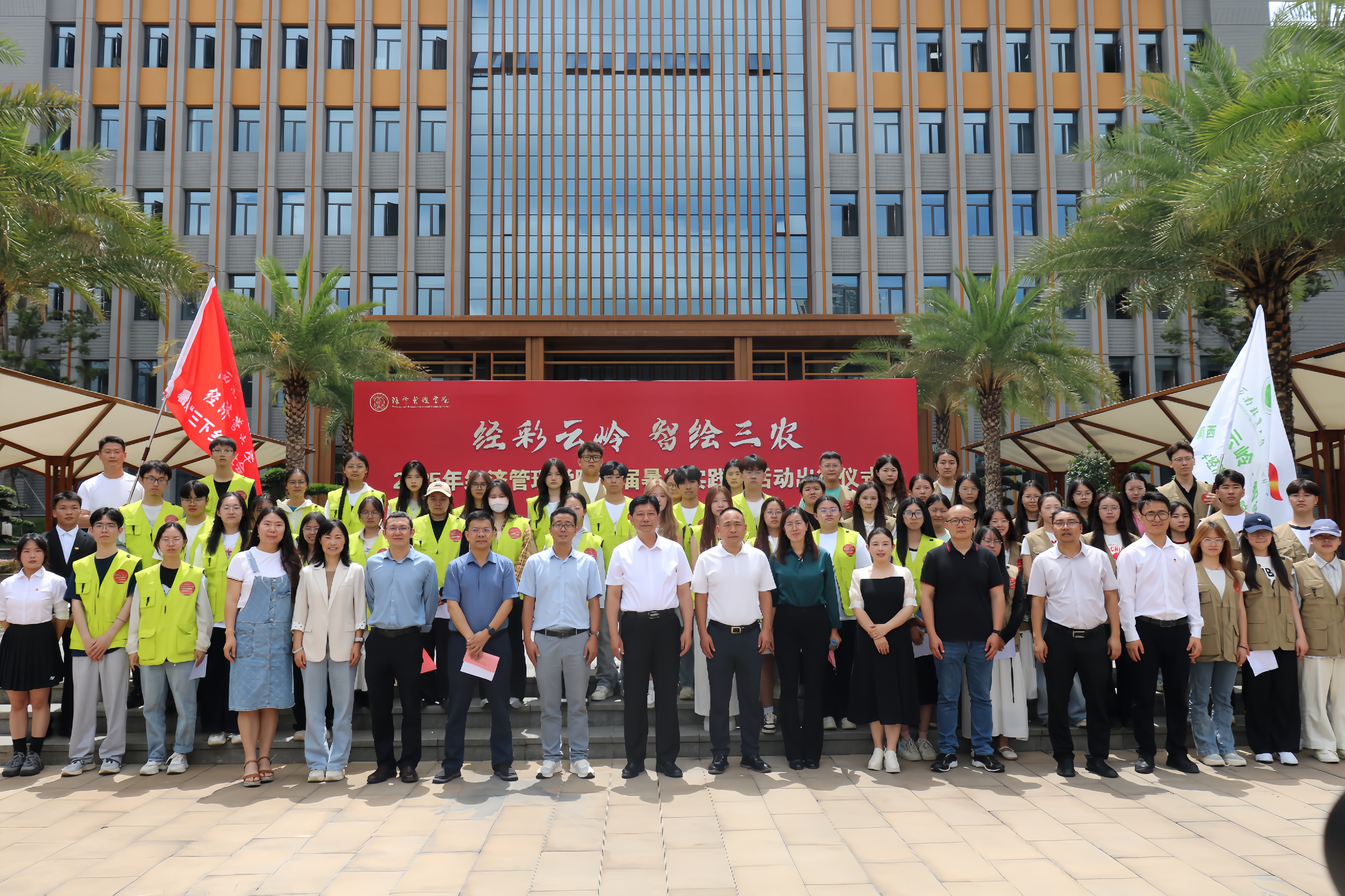 公司党委书记李永勤、副董事长郭华为各实践团队授旗,实践团代表江艳军、秦嘉郑重接过队旗,全场队员行注目礼,鲜艳的旗帜在风中猎猎作响。这不仅是责任与使命的传递,更凝聚着青春奔赴乡野、以所学报效国家的奋斗意志,象征着经管学子即将奔赴基层,以行动诠释“服务三农”的决心。