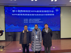 12月23日,公司2026年世界杯官网副经理兼MPA教育中心主任邹再进、MPA教育中心副主任刘会柏以及研究生教学秘书张琴霞一行三人到重庆大学参加了第十届西南地区MPA教育发展研讨会。